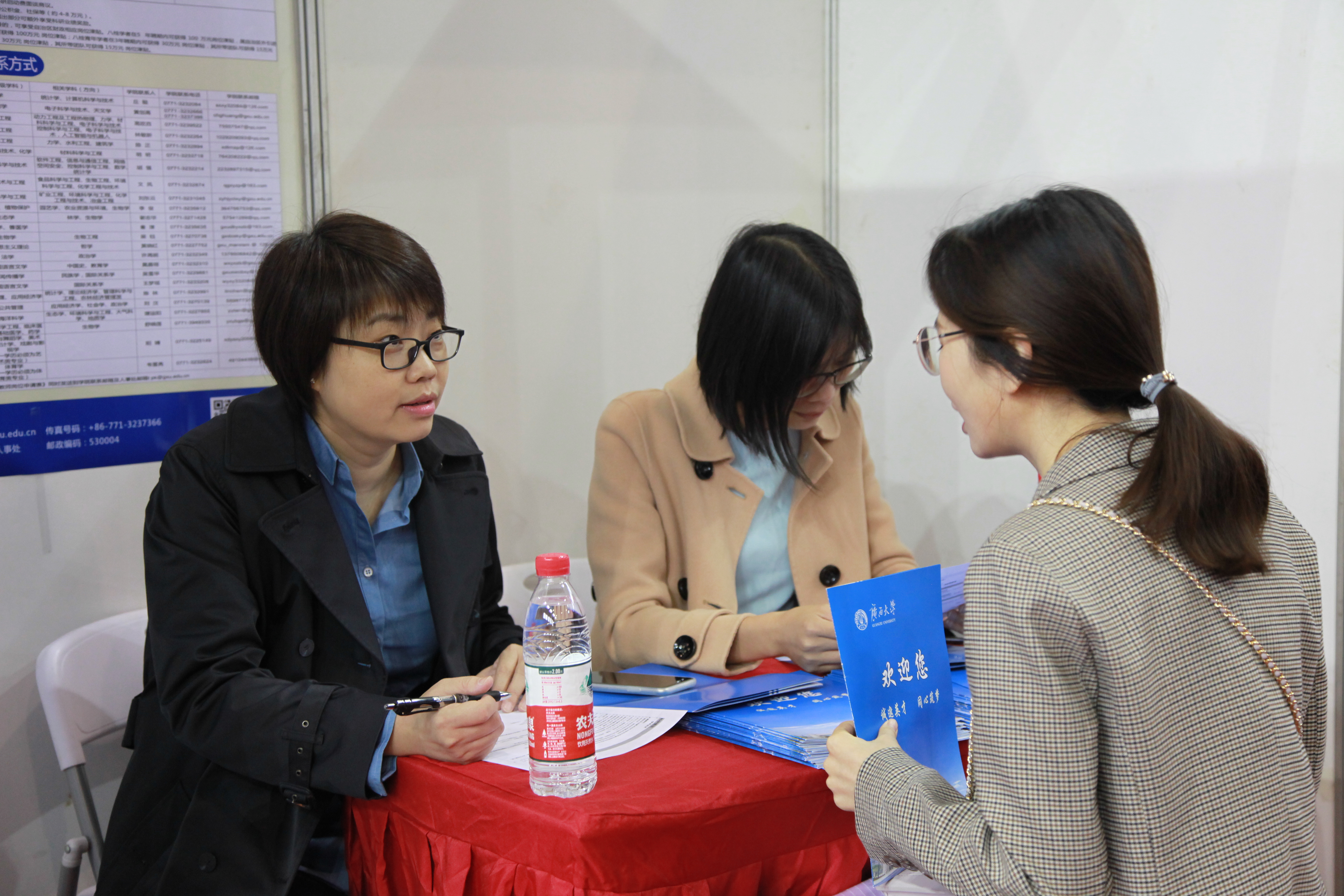 秦晅是中国地质大学(武汉)的博士研究生,当天他早早来到了会场,了解广西区内高校的招聘信息。他说,作为广西人,回家乡工作是他一直的首选。“主要我们广西现在发展越来越好了,和东盟国家交流密切,国家也对北部湾发展有政策支持,未来广西的前景是很好的,所以我希望回广西发展。”