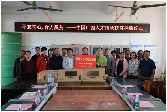 当天下午,在伏兴村委临时办公室里,举办了脱贫攻坚调研座谈会暨捐赠仪式。在座谈会上,自治区人才服务中心党委负责同志表示会一如既往地大力支持脱贫攻坚工作。马山县有关负责人感谢后援单位对伏兴村脱贫攻坚工作的支持,同时要求伏兴村委、驻村第一书记要严格按照财务管理规定接受捐赠物资,强化监督和检查,把好事做好、做实。最后,由中国广西人才市场现场为伏兴村委捐助价值5万元的办公桌椅、打印机、电脑等办公设施,进一步提升了村委的基础办公条件,助力脱贫攻坚。这是中国广西人才市场继2018年为该村集体经济产业发展捐助扶持资金15万元后的再一次帮扶。