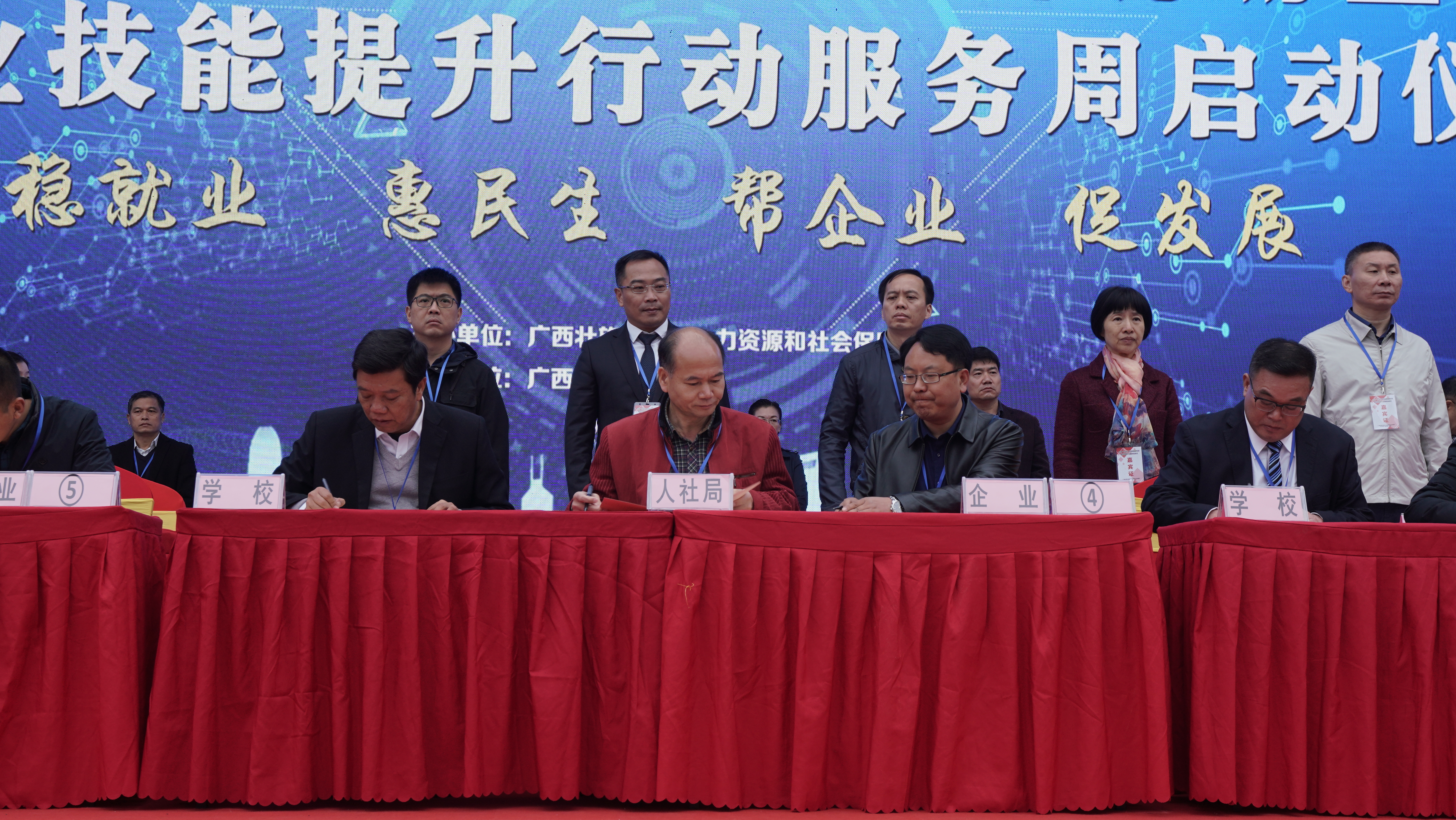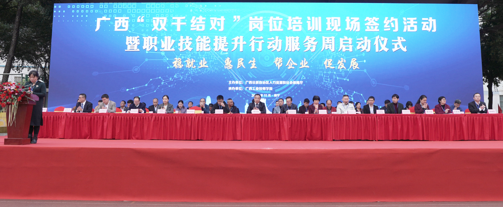 启动仪式由自治区人力资源社会保障厅主办,广西工业技师学院承办。自治区人力资源社会保障厅副厅长黄学军出席启动仪式并讲话,企业、培训机构代表分别发言。30对职业技能提升行动“双千结对”岗位培训代表单位进行“三方协议”现场签约。