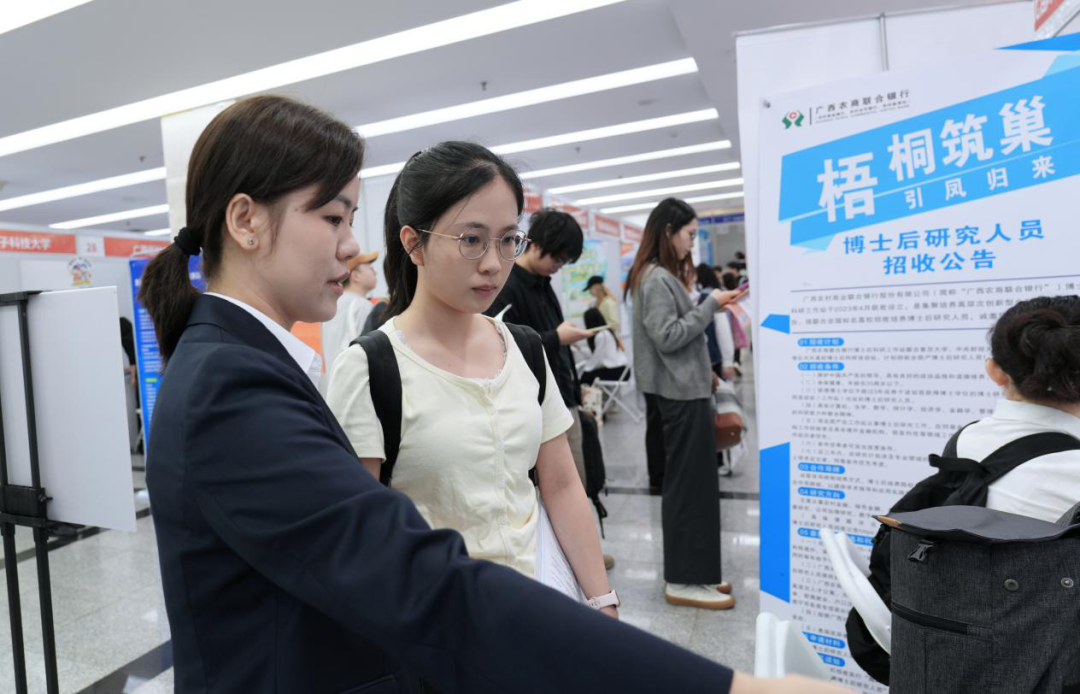 从事金融科技研究的硕士李萌,则被国海证券的“金融科技 + 东盟市场”业务布局打动:“广西对接东盟的区位优势独特,能把金融科技和跨境业务结合起来,对我来说是难得的成长机会。”现场,像王浩、李萌这样瞄准广西发展潜力的求职者不在少数,最终414人次达成初步录用意向,其中硕博人才占比96%,涵盖教育、信息技术、金融等多个领域。