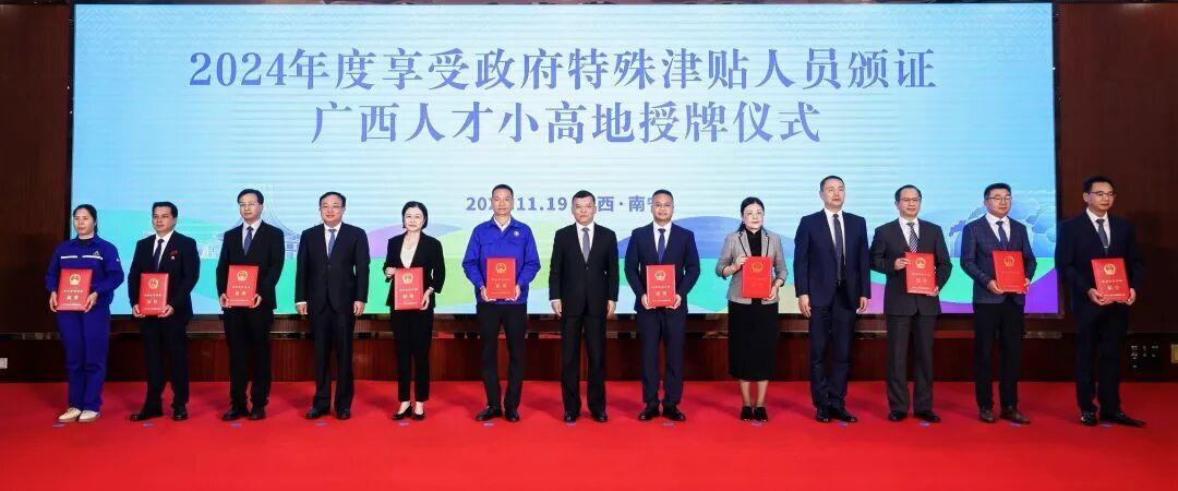 为深入贯彻落实党的二十届四中全会精神和习近平总书记关于做好新时代人才工作的重要思想,表彰先进、树立典型,进一步在全区营造“尊重劳动、尊重知识、尊重人才、尊重创造”的浓厚氛围,着力加强专业技术人才和技能人才队伍建设,发挥好人才项目在高层次创新型人才引育中的引领带动作用,11月19日,2024年度享受政府特殊津贴人员颁证仪式、广西人才小高地授牌仪式在南宁举行。自治区人民政府党组成员蓝晓;自治区人民政府副秘书长崔峻;自治区人力资源社会保障厅党组书记、厅长,自治区党委组织部副部长(兼)唐标文出席仪式,并为10位享受政府特殊津贴人员代表颁证,向8个新增的广西人才小高地授牌。