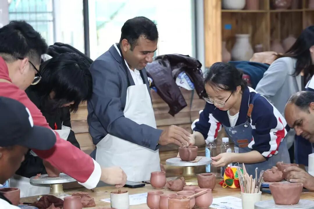 在广西二轻技师学院开展的“桂韵匠心 科创雅集”活动中,外国专家沉浸式体验儒家成人礼与广西特色礼俗的创意展演,观看机器人互动表演,感受文化与科技交融的独特魅力。亲身体验环节,外国专家化身“手艺人”,参与非遗陶艺手作、中西式面点制作等实践活动,近距离感受传统技艺的匠心传承。