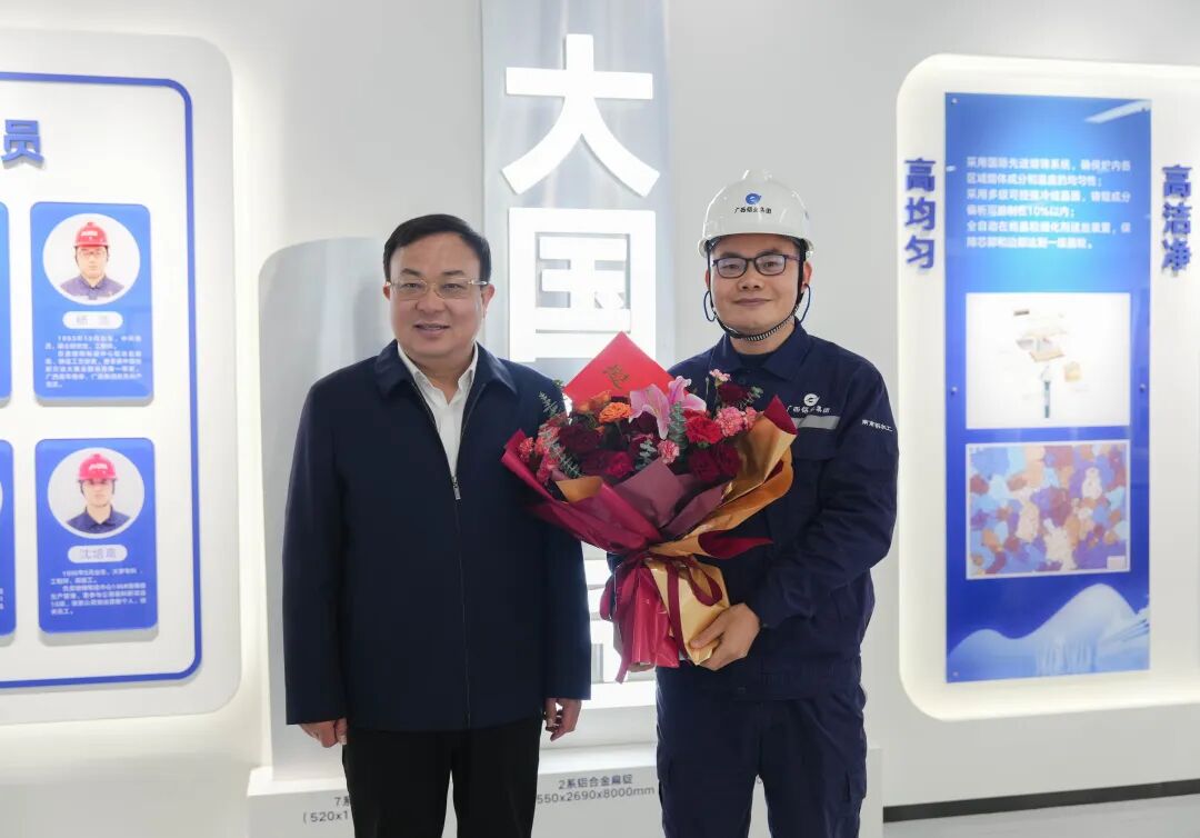 自治区人力资源社会保障厅党组书记、厅长,自治区党委组织部副部长(兼)唐标文(左一)慰问全国技术能手、国家级技能大师工作室领办人、享受政府特殊津贴人员、广西南南铝加工有限公司高级技师齐林