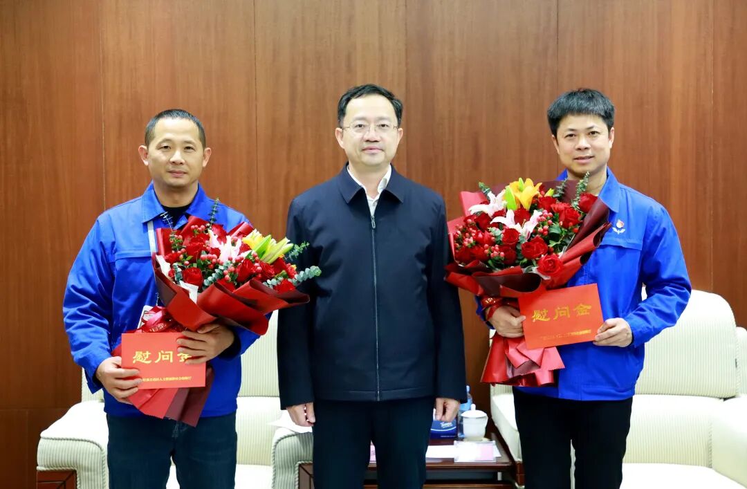 自治区人力资源社会保障厅党组书记、厅长,自治区党委组织部副部长(兼)唐标文(左一)慰问“大国工匠年度人物”、全国技术能手、国家级技能大师工作室领办人,享受政府特殊津贴人员、广西南南铝加工有限公司特级技师陈仁桂
