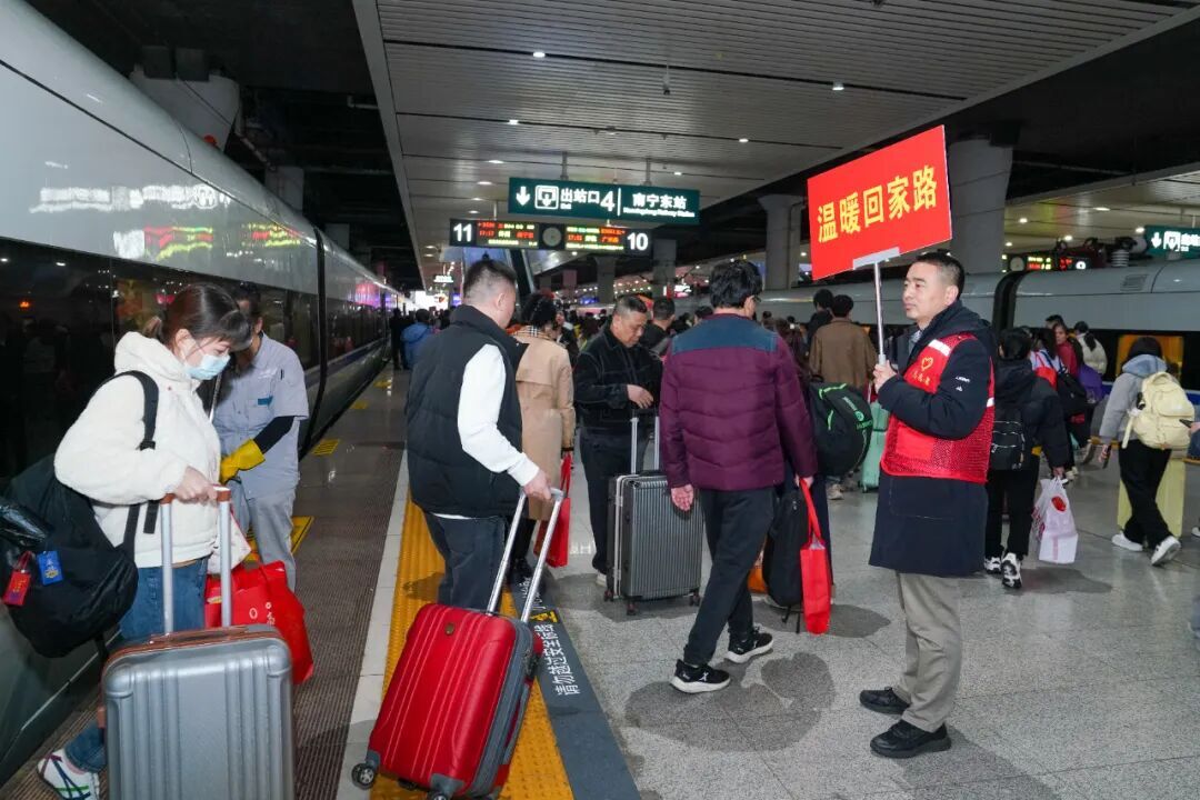 当天下午17时前后,随着D3680和D596次动车缓缓驶入南宁东站,1905名广西籍务工人员带着一年的收获与期盼平安抵达。自治区人力资源社会保障厅党组成员、副厅长韦杰与自治区总工会副主席、党组成员黄韬,中国铁路南宁局集团有限公司南宁东站党总支书记、站长鲁谨任等在站台为返乡人员送上装满新春祝福、就业政策、权益保障指南的“暖心礼包”,让务工人员刚下车就感受到家乡的温暖。“每年春节回家最愁抢票,今年人社部门直接安排专列,还不用花钱,太贴心了!”来自南宁的务工人员李女士拿着暖心礼包,脸上满是笑容。