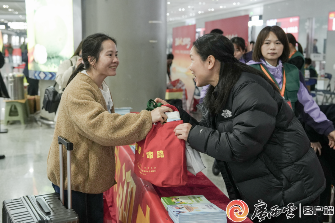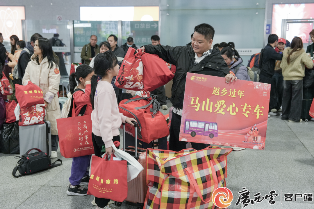 “一到站就收到慰问,心里暖暖的!”一名来自崇左的阿姨笑着说。她的儿子儿媳都是盲人,在广东经营一家盲人按摩馆,“年前是生意最忙的时候,他们忙着打拼挣钱,我就先带孩子们回来。”一句朴实的话,道出了万千务工人员为小家奋斗、盼阖家团圆的心愿。