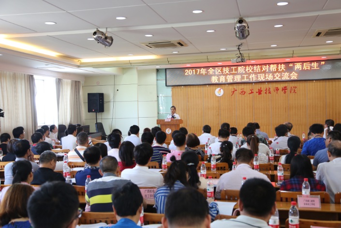 5月26日,2017年全区技工院校结对帮扶“两后生”教育管理工作现场交流会在南宁举行。本次交流会由自治区人社厅主办,来自全区43所技工院校120多名教育工作者参加了会议。广西工业技师学院和广西南宁技师学院在会上介绍了结对帮扶“两后生”教育管理工作经验,师生代表分享了工作学习感言,“两后生”同学们展示了一年来的学习收获和素质教育成果。