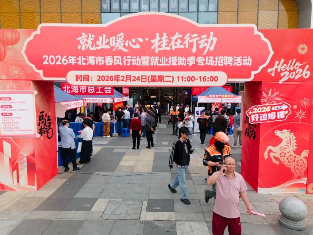 2月24日,“就业暖心・桂在行动”2026年北海市春风行动暨就业援助季专场招聘活动在银海区万达广场2号门圆满落幕。本次活动由市人力资源和社会保障局牵头组织,联合北海市退役军人事务局、北海市总工会、共青团北海市委员会、北海市妇女联合会、北海市残疾人联合会等多部门协同发力,以“精准对接、暖心服务”为核心,汇聚120家优质企业,通过“线下招聘+直播带岗+互动福利”三维模式,为求职者与用工企业搭建高效对接桥梁,切实打响2026年稳就业“第一枪”。