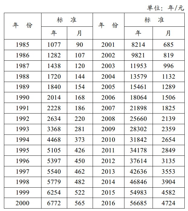 注:其中 2016 年度数据为自治区统一规定的核定缴费工资基数计算依据。