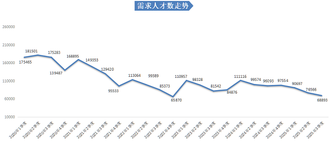 在人才需求方面,本季度有招聘需求的用人单位需求人才数为68893人,较上年同期的96093人减少27200人,同比下滑28.31%;同时较2025年第二季度的76566人减少7673人,环比下滑10.02% ,延续了人才需求的下行趋势。