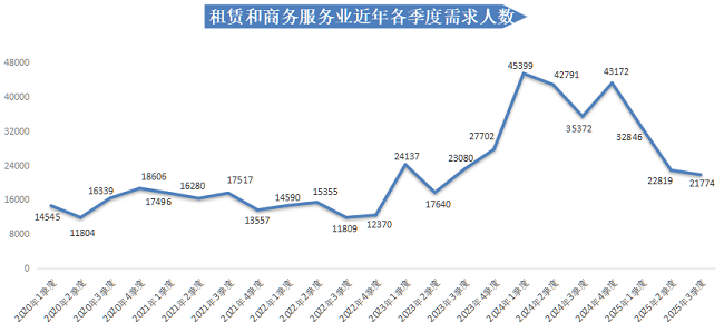 在24个主要行业类别中,有超过五成行业类别的人才需求相较于上年同期出现不同程度的下滑。其中,需求减少主要集中在租赁与商务服务业中,需求人才数为21774人,比上年同期减少13598人,同比下滑38.44%,是本季度人才需求量同比减少最多的行业类别。