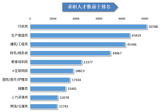 在行业分布中,人才需求量排名前五的行业类别分别为:租赁和商务服务业、制造业、信息传输/计算机服务和软件业、建筑业、教育业,这五个行业合计需求人才数占比达到70.86%。