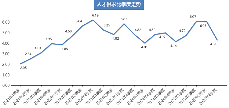 2025年第四季度,广西人才网中人才供求比为4.31,即超过4个人竞争1个岗位,与去年同期基本持平(同比微增0.17),但与上季度的6.03相比减少了1.72,就业压力较上季度得到一定缓解。