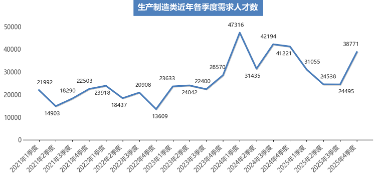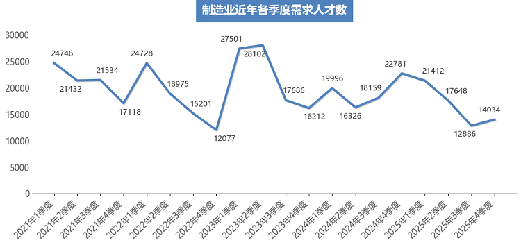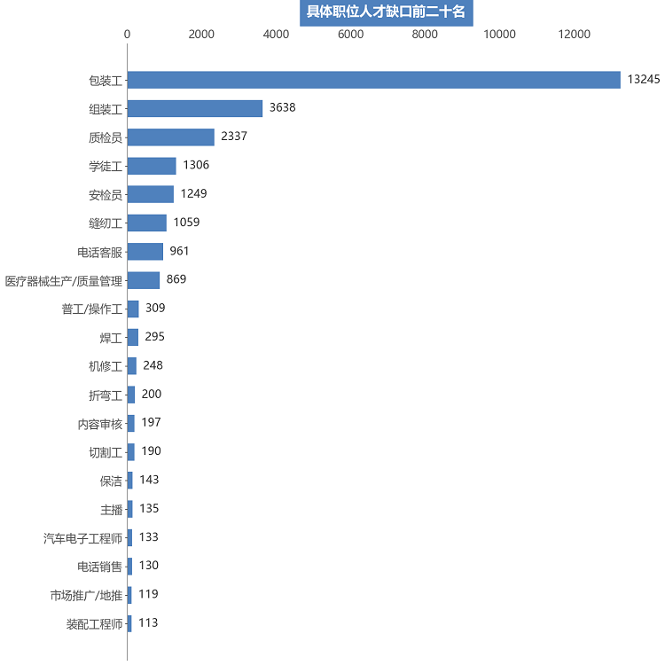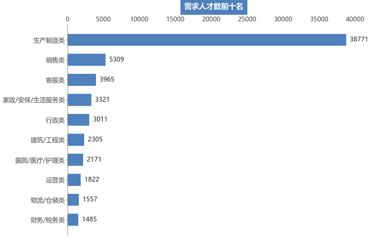在24个主要行业类别中,有近半数行业类别的人才需求相较于上年同期出现不同程度的下滑。其中,需求减少主要集中在制造业中,需求人才数为14034人,比上年同期减少8747人,同比下滑38.40%,是本季度人才需求量同比减少最多的行业类别。