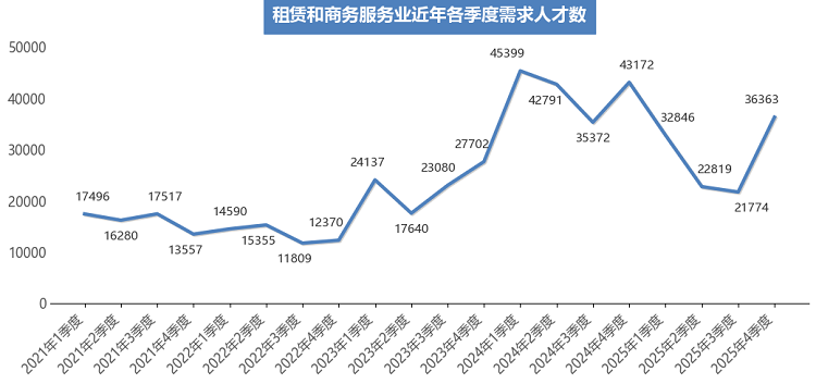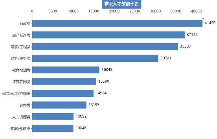 在行业分布中,人才需求量排名前五的行业类别分别为:租赁和商务服务业、制造业、信息传输/计算机服务和软件业、建筑业、居民服务和其他服务业,这五个行业合计需求人才数占比达到78.23%。