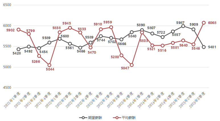 2025年第三季度广西人才网中用人单位发布职位的平均薪酬(其定义见注4,下同)为6068元/月,环比增长9.42%,同比增长10.00%;而求职者期望薪酬(其定义见注4,下同)为5481元/月,环比下降7.24%,同比下降4.22%。