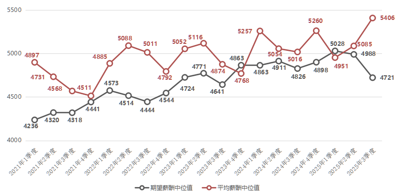 2025年第三季度,薪酬最高的前五位职位类别分别为:能源/地质类11866元/月、法律服务类10684元/月、高端技术类9456元/月、咨询/调研类9417元/月、投融资类9350元/月。与此同时,部分职位的平均薪酬水平仍处于较低水平,其中薪酬最低的前五位职位类别分别为:安保服务类3749元/月、家政/保洁类3876元/月、服装/纺织/皮革类4034元/月、后厨类4147元/月、文化艺术类4151元/月。