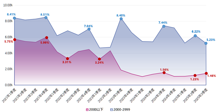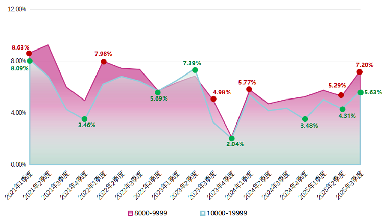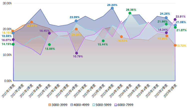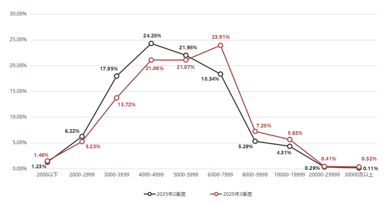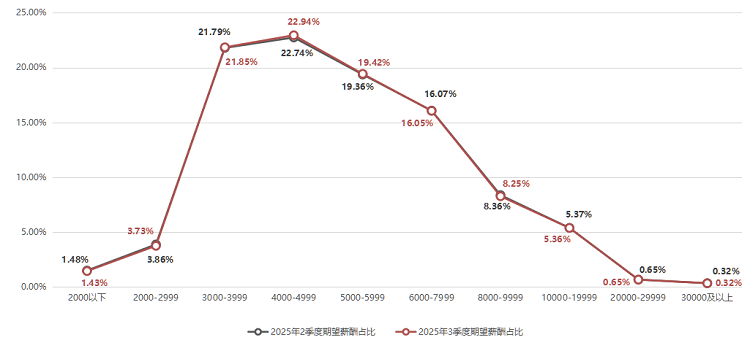 2025年第三季度,求职者期望薪酬区间的占比呈现整体稳定、集中度较高的特点。从具体区间来看,3000-3999元/月区间、4000-4999元/月区间的求职者期望薪酬占比均超过20%,是求职者期望的主流薪酬区间;同时,5000-5999元/月、6000-7999元/月区间的占比也均超10%。