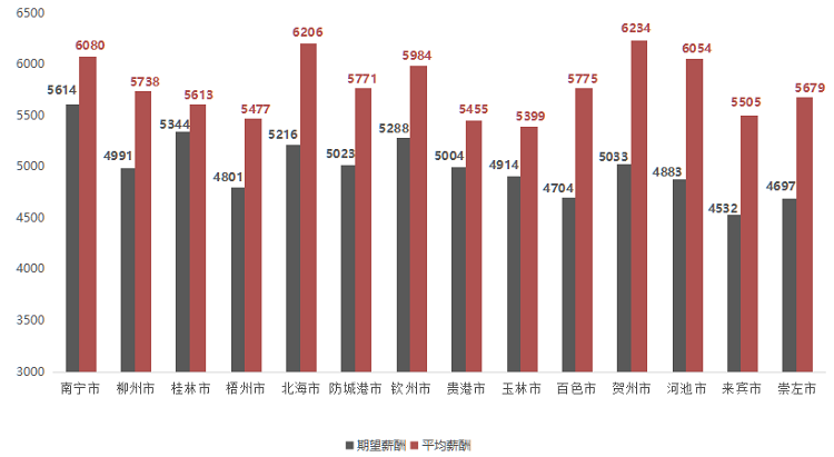 广西人才网中区内主要工作地对应的求职者期望薪酬和职位平均薪酬水平分布图如下(单位:元/月):