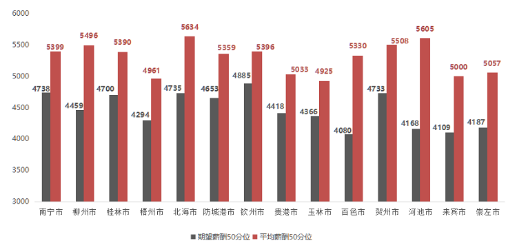 广西人才网中区内主要工作地对应的求职者期望薪酬中位值和职位平均薪酬中位值水平分布图如下(单位:元/月):