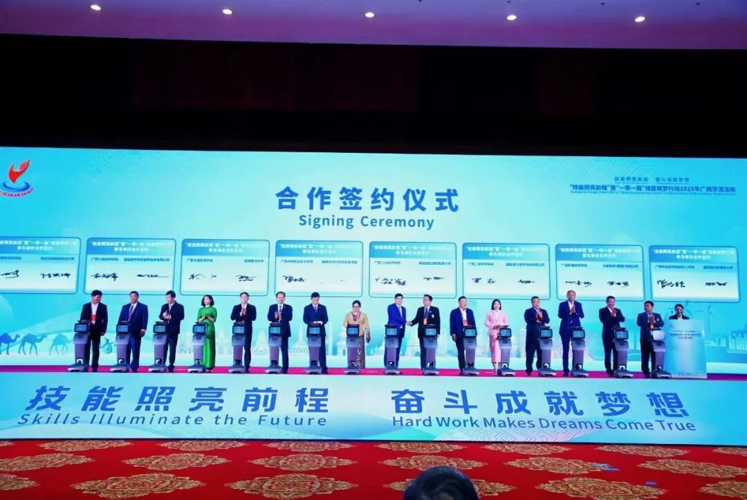 交流活动上发布广西技能筑梦培训基地、师资培训中心名单和培训开发合作平台资源,广西2025年境外职业技能比照认定目录,广西双语教材目录以及《成立珠江流域“一带一路”技能筑梦行动合作联盟南宁倡议》。