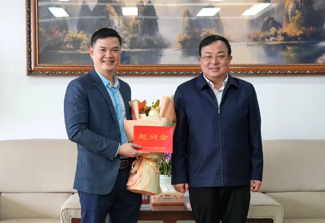厅党组成员、副厅长、一级巡视员乐永红(右一)慰问享受政府特殊津贴人员、“广西科技进步一等奖”获得者、广西医科大学第一附属医院主任医师赖永榕