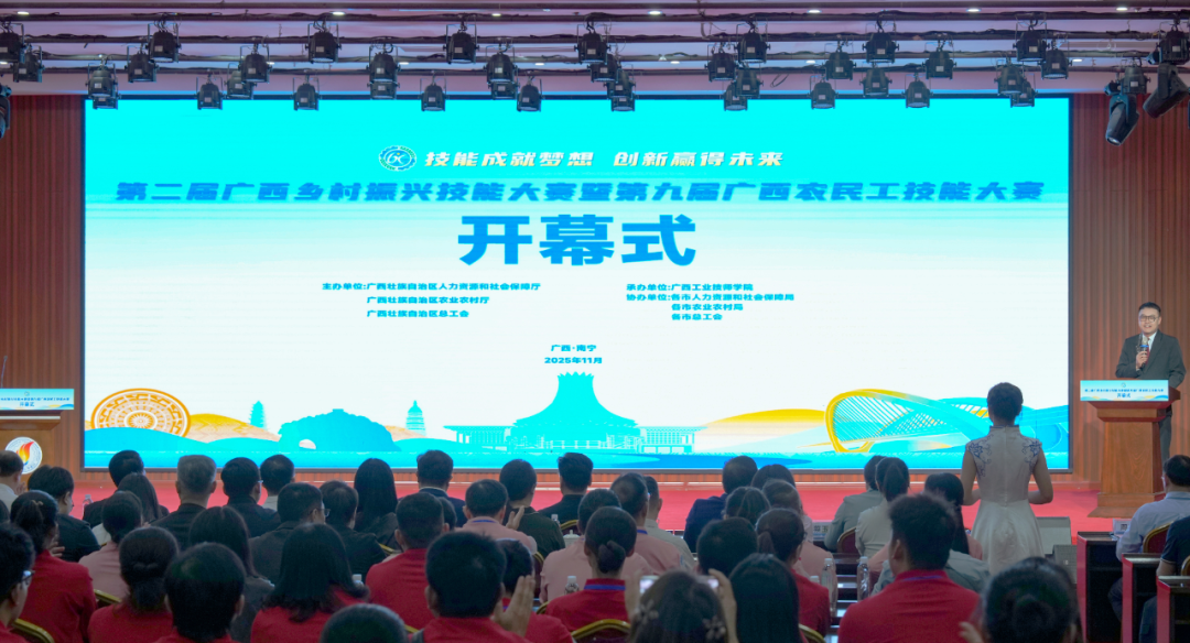 技能照亮前程,奋斗成就梦想。开幕式上,舞蹈《匠舞・筑光》通过人形机器人与舞者的配合,展现广西农民工技能工匠的活力与激情,参赛选手代表、裁判员代表先后上台宣誓。