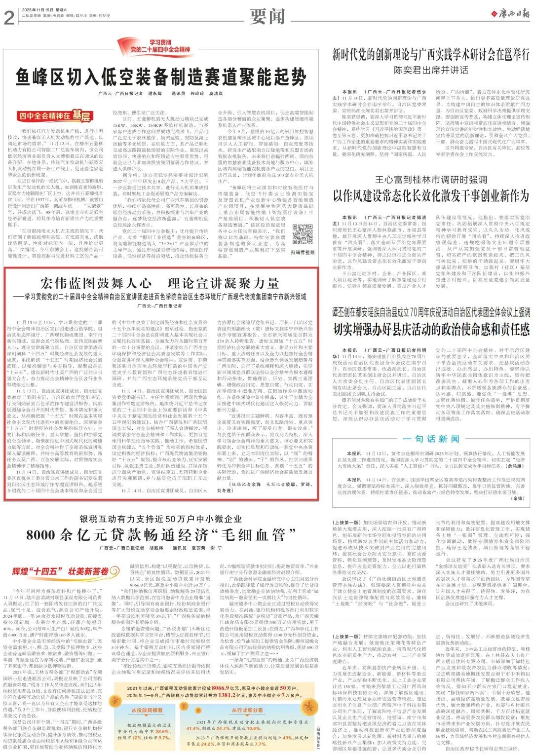 11月13日至14日,学习贯彻党的二十届四中全会精神自治区宣讲团走进百色学院、自治区生态环境厅、广西现代物流集团、南宁市新兴领域,宣讲会场气氛热烈。宏伟蓝图鼓舞人心,理论宣讲凝聚力量。自治区宣讲团成员深刻阐释“十四五”时期经济社会发展的重大成就,系统解读“十五五”时期经济社会发展蓝图,以精准解读与务实指导,凝聚起奋进“十五五”、建设新时代壮美广西的广泛共识与强大合力,奋力推动全会精神在全区各行业各领域落地生根。