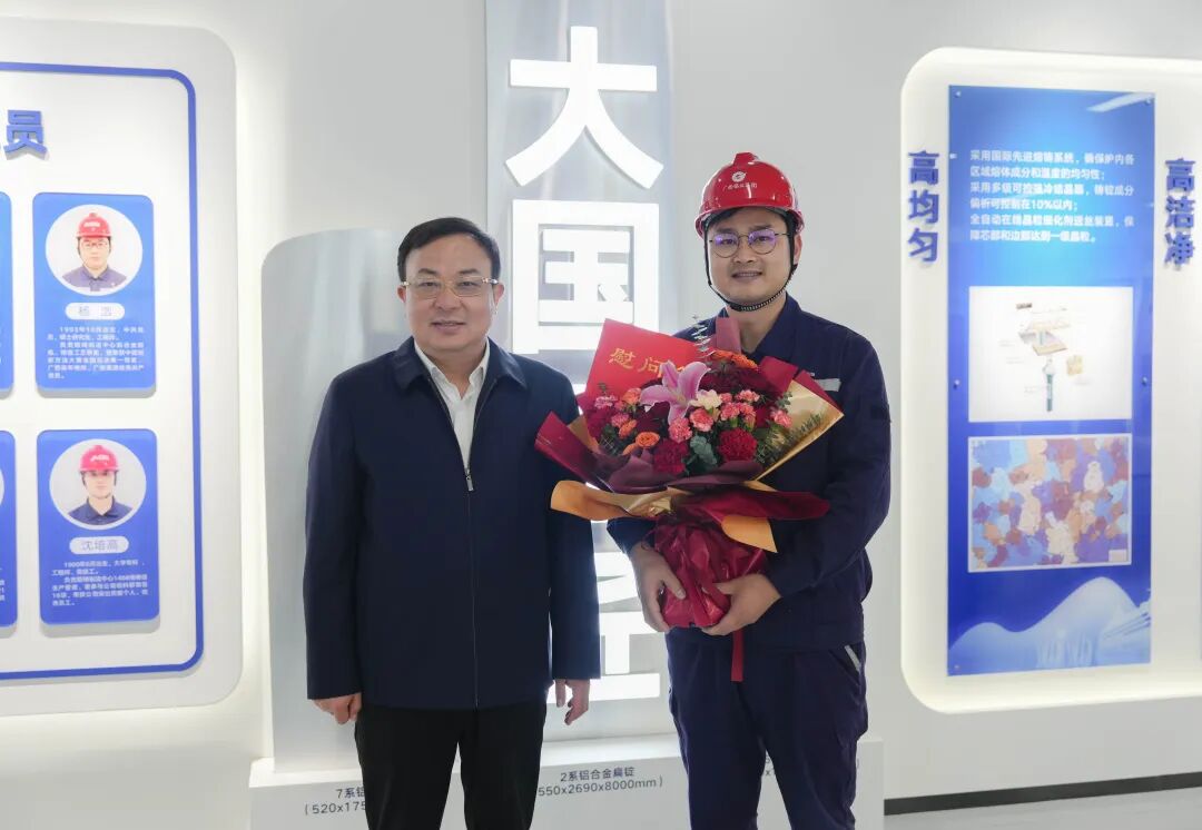 自治区人力资源社会保障厅党组书记、厅长,自治区党委组织部副部长(兼)唐标文(左一)慰问全国技术能手、国家级技能大师工作室领办人、享受政府特殊津贴人员、广西南南铝加工有限公司高级技师齐林
