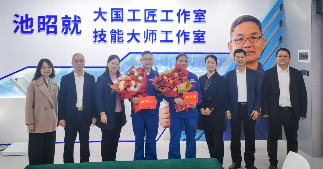 自治区人力资源社会保障厅党组书记、厅长,自治区党委组织部副部长(兼)唐标文(左一)慰问“大国工匠年度人物”、全国技术能手、国家级技能大师工作室领办人,享受政府特殊津贴人员、广西南南铝加工有限公司特级技师陈仁桂
