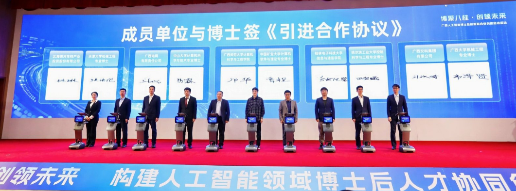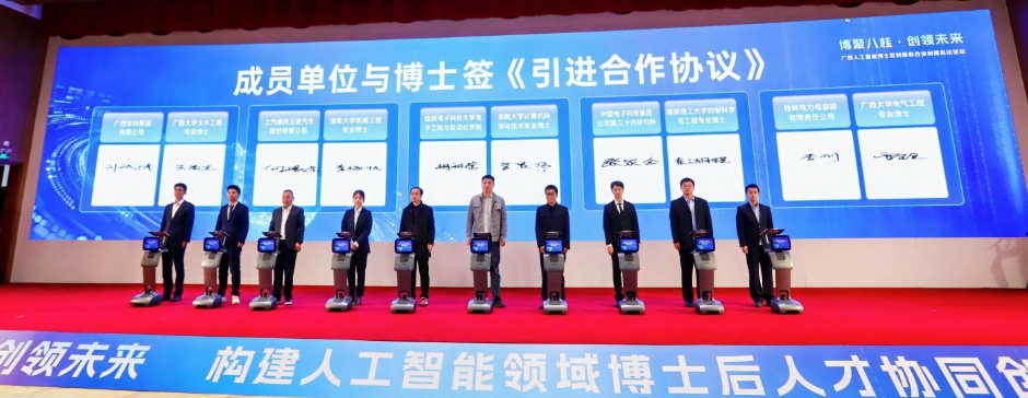 启动仪式上,博联体11家成员单位代表现场签署共建协议并接受牌匾。协议明确博联体的定位与使命,在博士后联合培养、技术攻关等方面开展深度协作,标志着广西人工智能领域博士后工作步入“产学研用”协同发展的全新阶段。随后,10名即将在广西全职从事博士后研究的博士与博联体成员单位现场签订引进合作协议,实现“人才—平台—产业”的精准对接。中科院院士姚建铨、北京百度网讯科技有限公司教育科研拓展部副总监包泽斌等来自区内外人工智能领域知名专家颁发博联体学术委员会委员聘书。