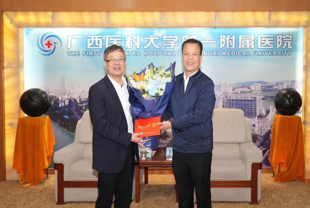 自治区人力资源社会保障厅党组书记、厅长,自治区党委组织部副部长(兼)唐标文(左一)慰问广西壮族自治区人民医院院长、广西促进国家区域医疗中心建设人才小高地团队带头人李健