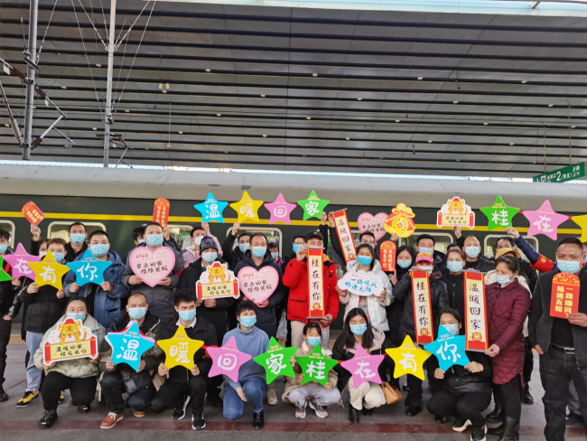 “京津晋桂北向南,核酸报告阴才返。活动有心好事来,桂乡朋友乐开怀……”2022年1月22日16时05分,第一批103名广西在京务工创业人员乘坐Z5次列车(北京西站开往南宁站)踏上回家旅途,在列车中定制“返乡爱心车厢”里传出山歌阵阵。