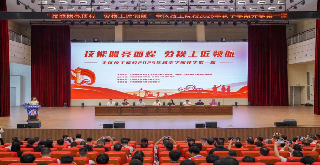 近日,2025年全区技工院校秋季学期“开学第一课”活动在广西机电技师学院举行。广西壮族自治区人力资源和社会保障厅党组成员、副厅长覃朝俊,中国人力资源和社会保障出版集团党委委员、副总经理赵明皓出席活动并讲话。