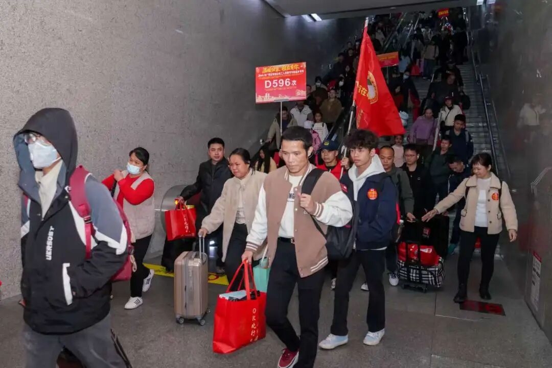 当天下午17时前后,随着D3680和D596次动车缓缓驶入南宁东站,1905名广西籍务工人员带着一年的收获与期盼平安抵达。自治区人力资源社会保障厅党组成员、副厅长韦杰与自治区总工会副主席、党组成员黄韬,中国铁路南宁局集团有限公司南宁东站党总支书记、站长鲁谨任等在站台为返乡人员送上装满新春祝福、就业政策、权益保障指南的“暖心礼包”,让务工人员刚下车就感受到家乡的温暖。“每年春节回家最愁抢票,今年人社部门直接安排专列,还不用花钱,太贴心了!”来自南宁的务工人员李女士拿着暖心礼包,脸上满是笑容。