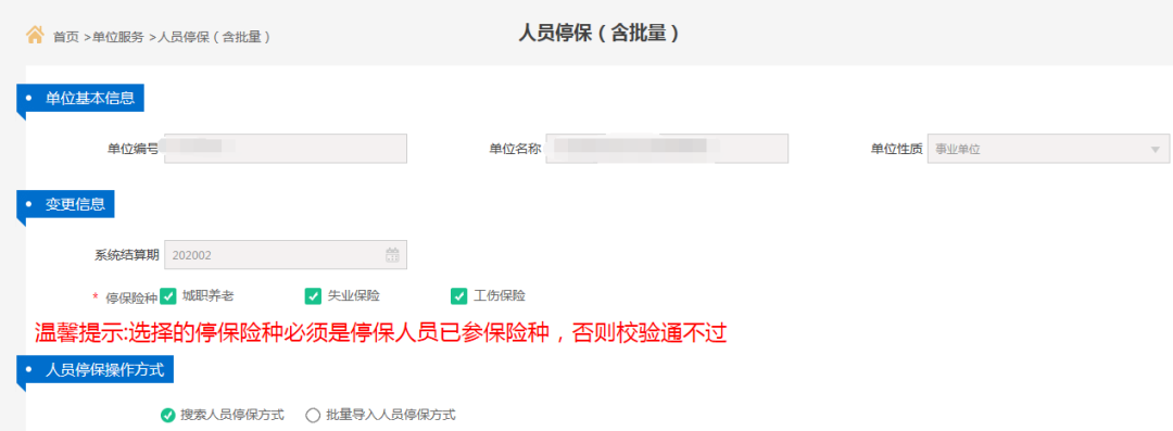 2.选择人员停保操作方式,系统默认“搜索人员停保方式”。如下图:
