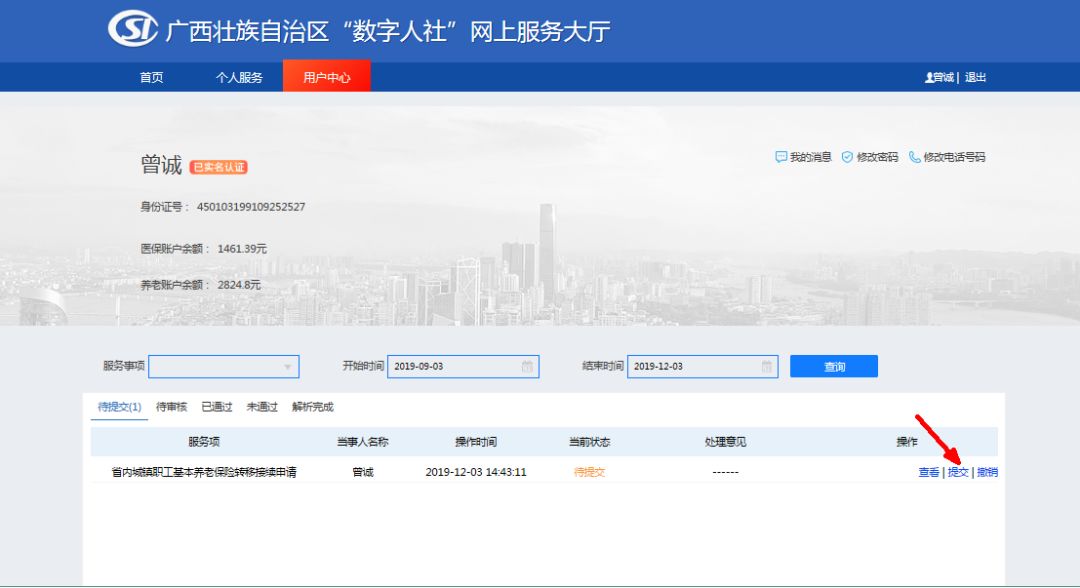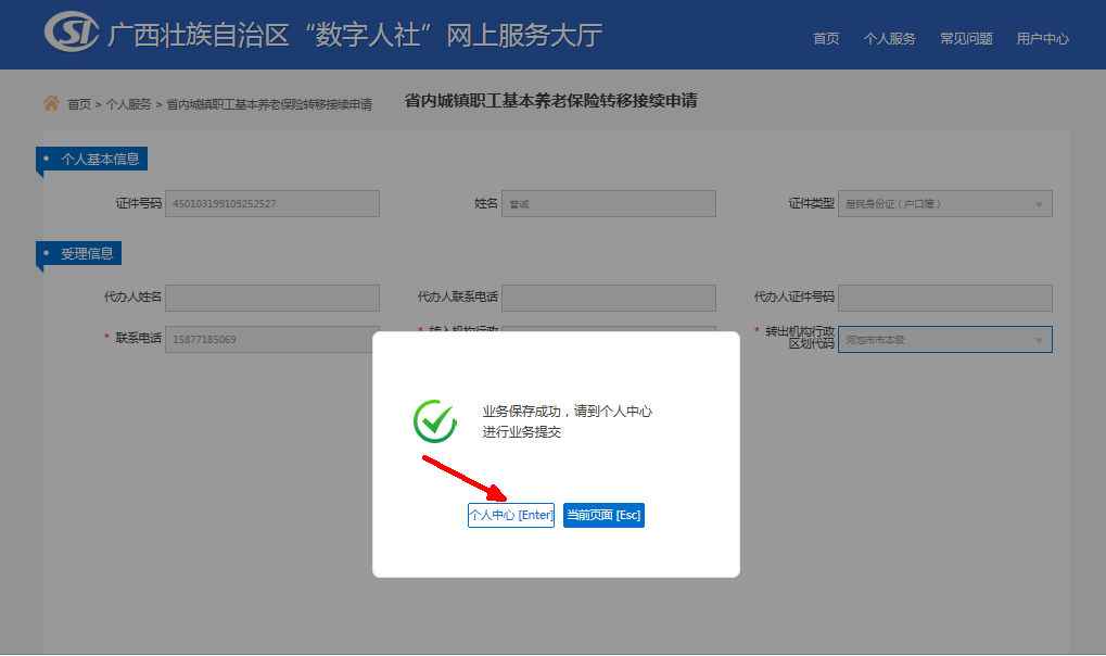 登录网上服务大厅http://rswb.gx12333.net后点击“登录”(首次登录网报系统的先进行注册后再登录)→点击“个人用户”,输入登录信息后点击“普通登录” →点击“个人服务”→点击“转移接续业务”→点击“省内城镇职工基本养老保险关系转移接续申请” →点击“在线办理” →进入“省内城镇职工基本养老保险转移接续申请”界面,录入个人信息→点击“保存”→点击“去个人中心提交转移申请”→点击“提交”→点击“确定”。