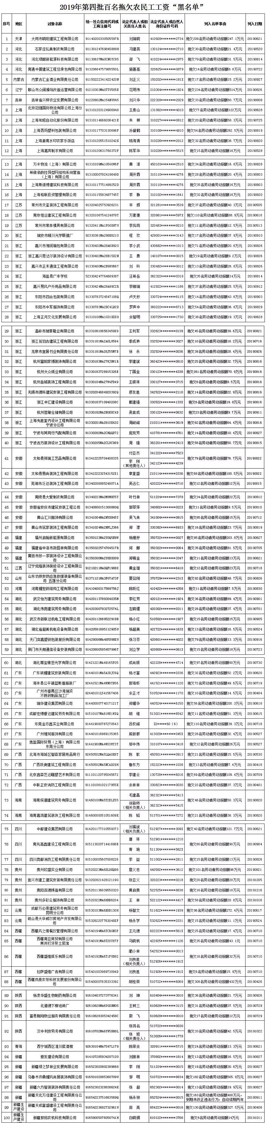 人社部公布2019年第四批百名拖欠农民工工资“黑名单”
